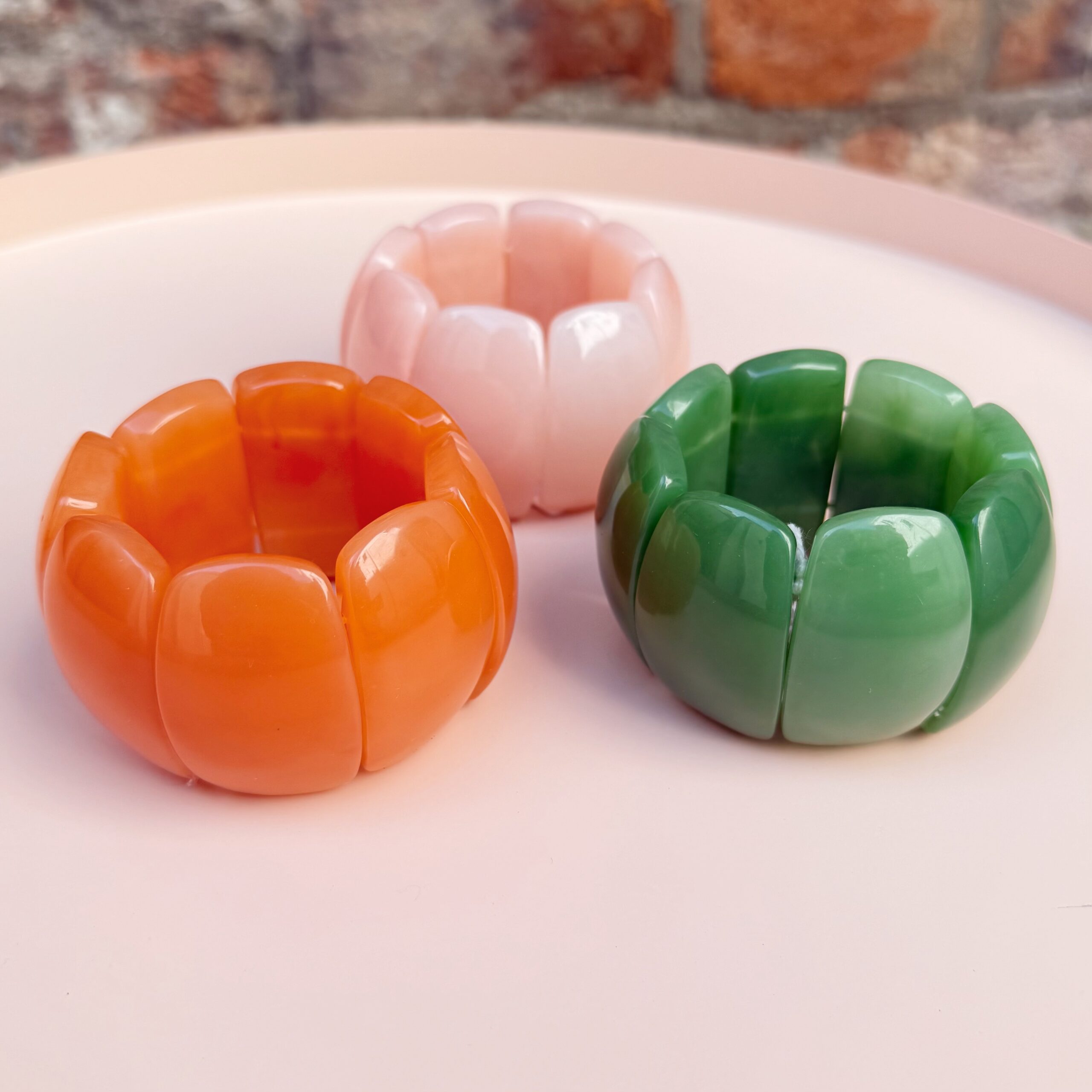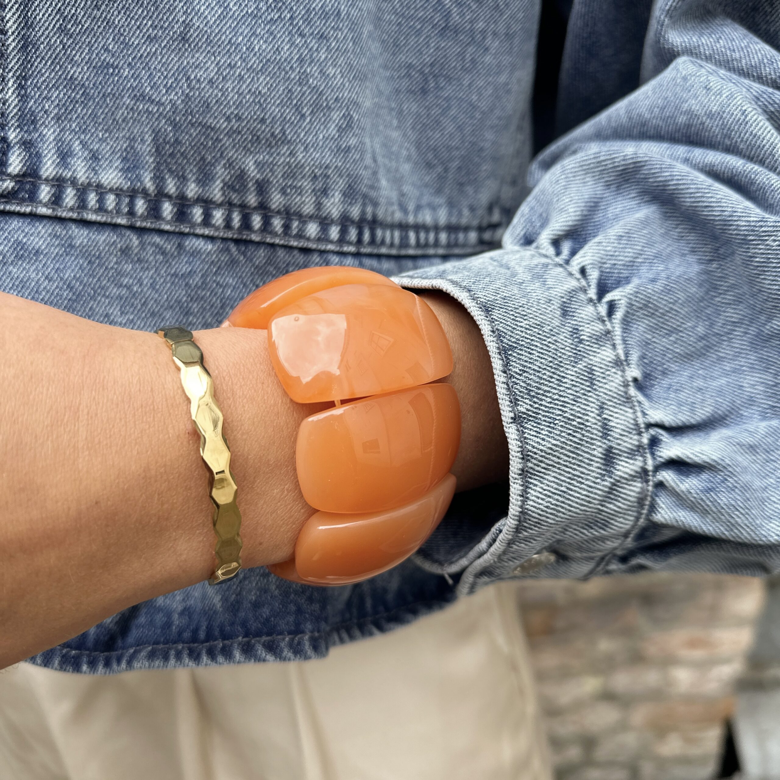 Armband Color Pop – voeg een speels kleuraccent toe aan je outfit! Deze brede armband is elastisch en daardoor supercomfortabel om te dragen. Verkrijgbaar in fris groen, zacht roze en warm oranje. De glanzende, chunky schakels maken hem een echte eyecatcher voor iedere gelegenheid. One size fits all, dus je schuift hem moeiteloos om.