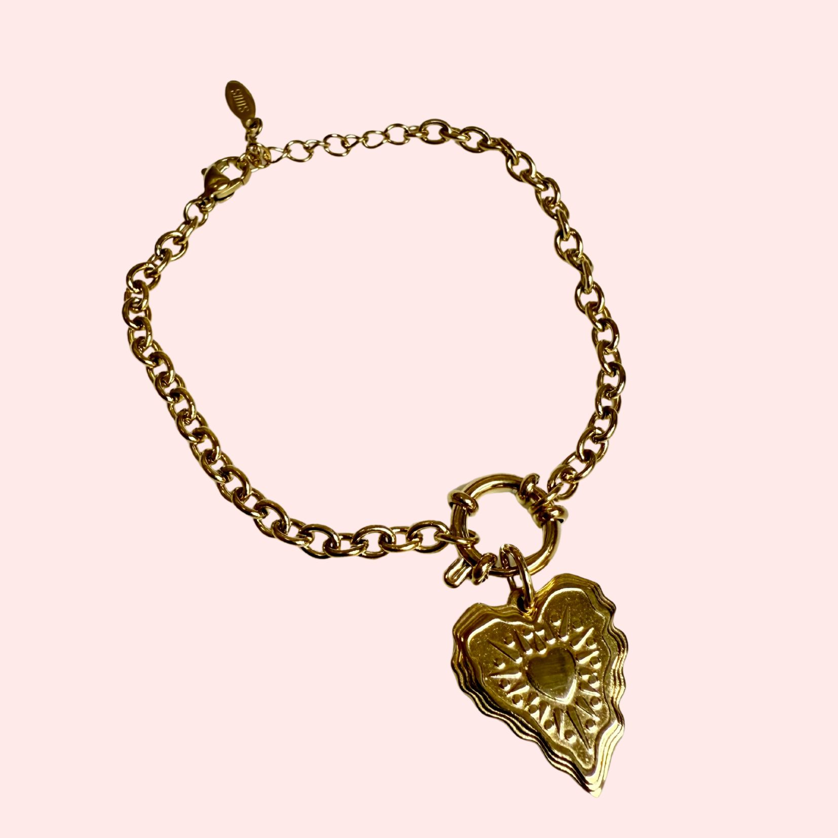Shine bright, girls! Deze prachtige armband met chunky schakel en opvallende hartbedel is dé finishing touch voor elke look. Het gouden hart heeft een speels, almost vintage glow waardoor hij écht opvalt — perfect voor zowel daily wear als een night out.