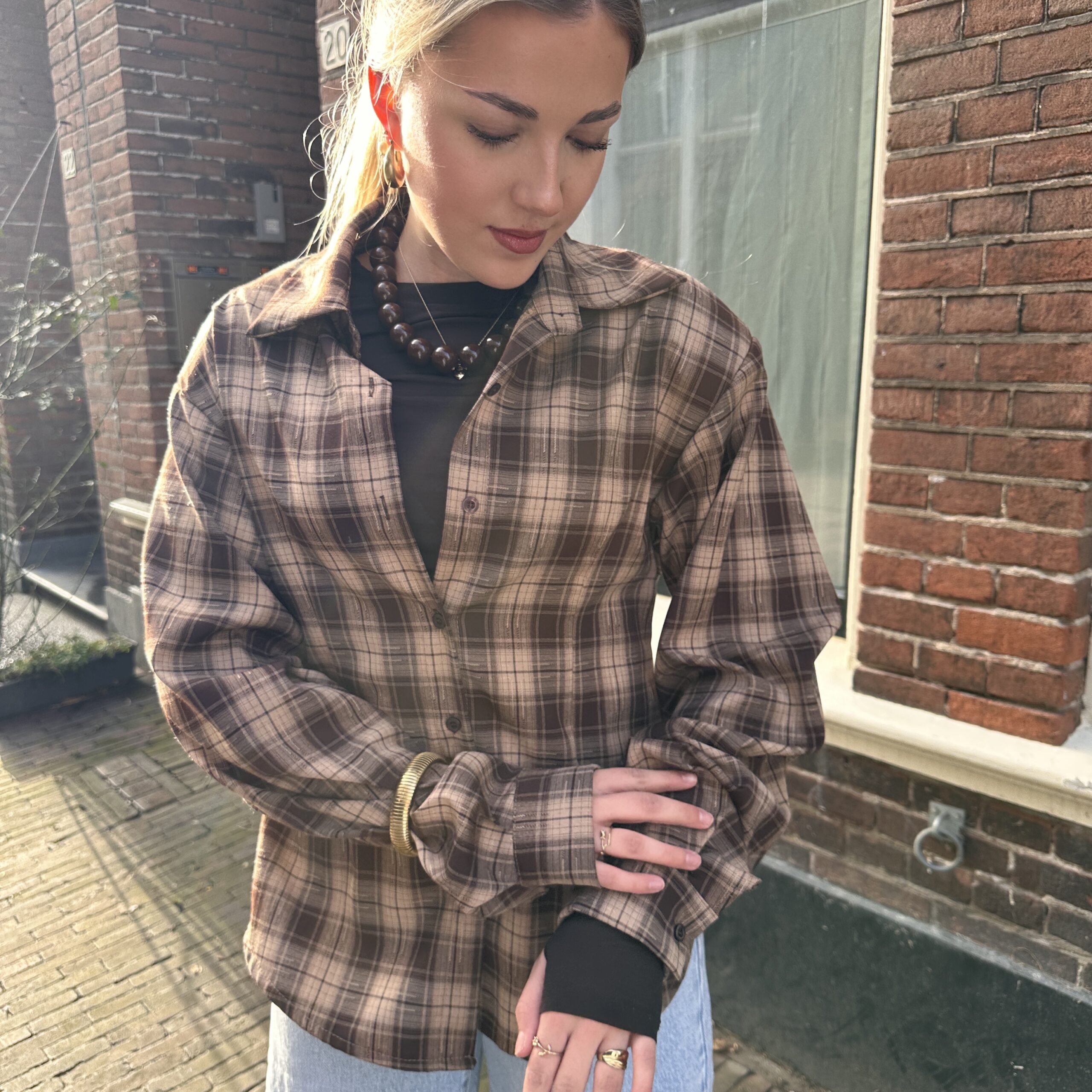 De blouse heeft een losvallend model en is perfect om open te dragen over een top of dichtgeknoopt als statement piece. De warme brown tones geven een cozy maar tegelijkertijd classy uitstraling — ideaal voor een effortless everyday look.