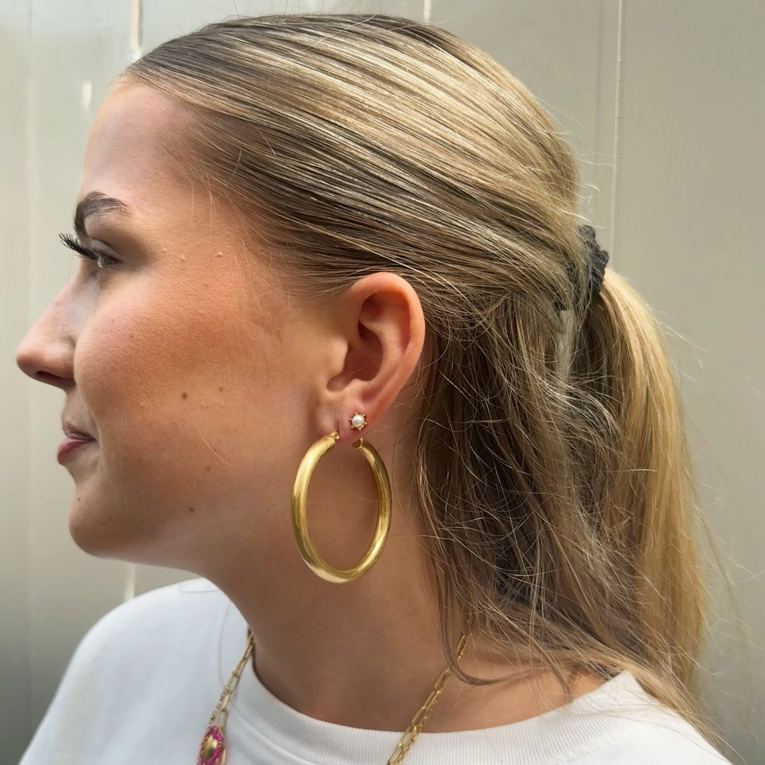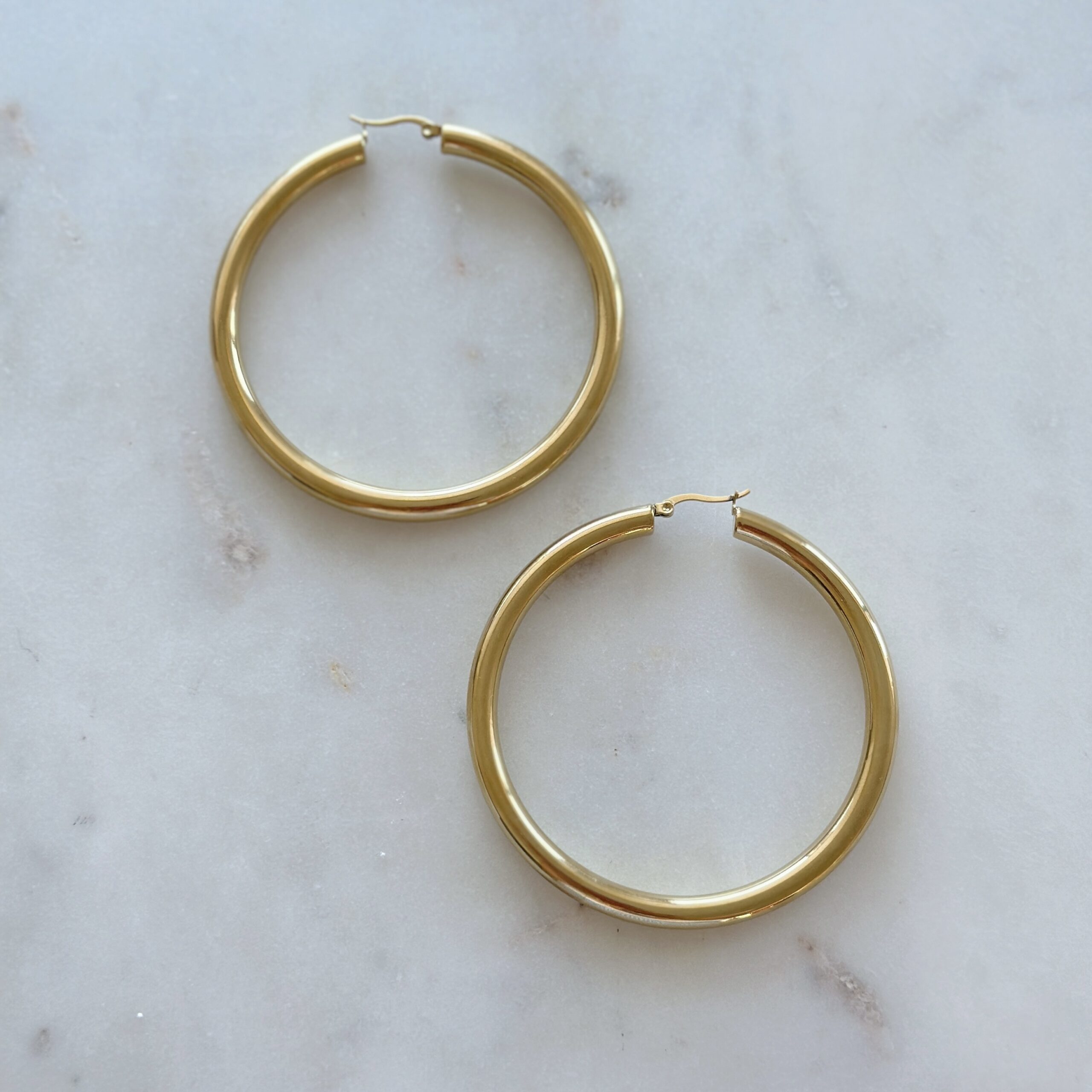 Hoops Golden Bold zijn 5 mm brede oorringen van stainless steel die je look in één beweging naar een hoger niveau tillen. Tijdloos en toch uitgesproken: de perfecte everyday essential voor wie van bold basics houdt. Lichtgewicht, waterproof én eindeloos te combineren. Draag ze solo of met een ear cuff voor een opvallende ear party.