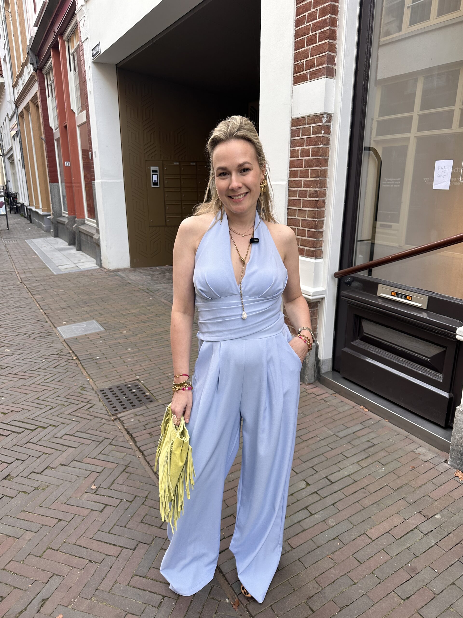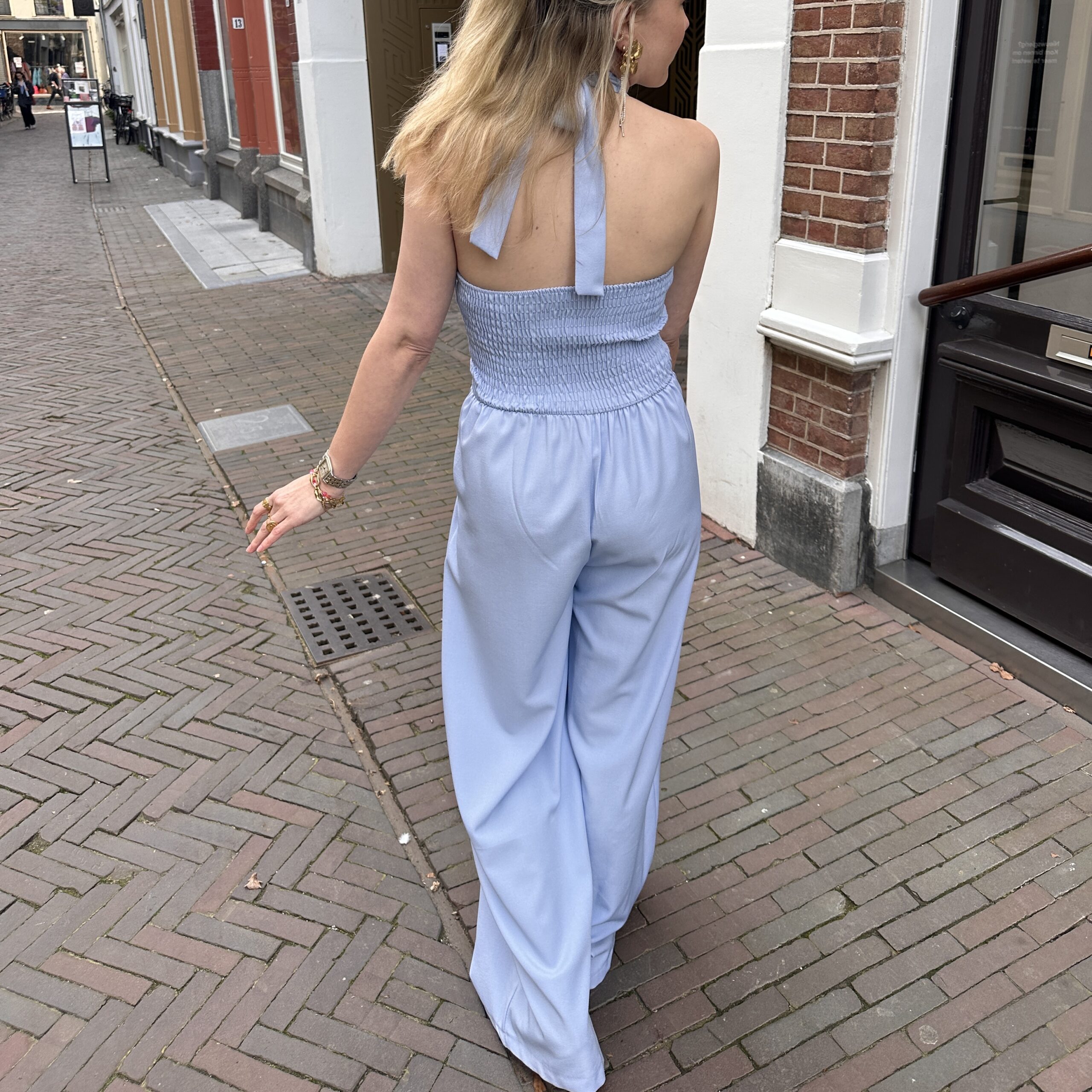 De elegante haltertop met striksluiting in de nek geeft een mooie open rug en een vrouwelijke fit. De jumpsuit heeft al cups, waardoor hij super fijn zit en je geen bh nodig hebt.