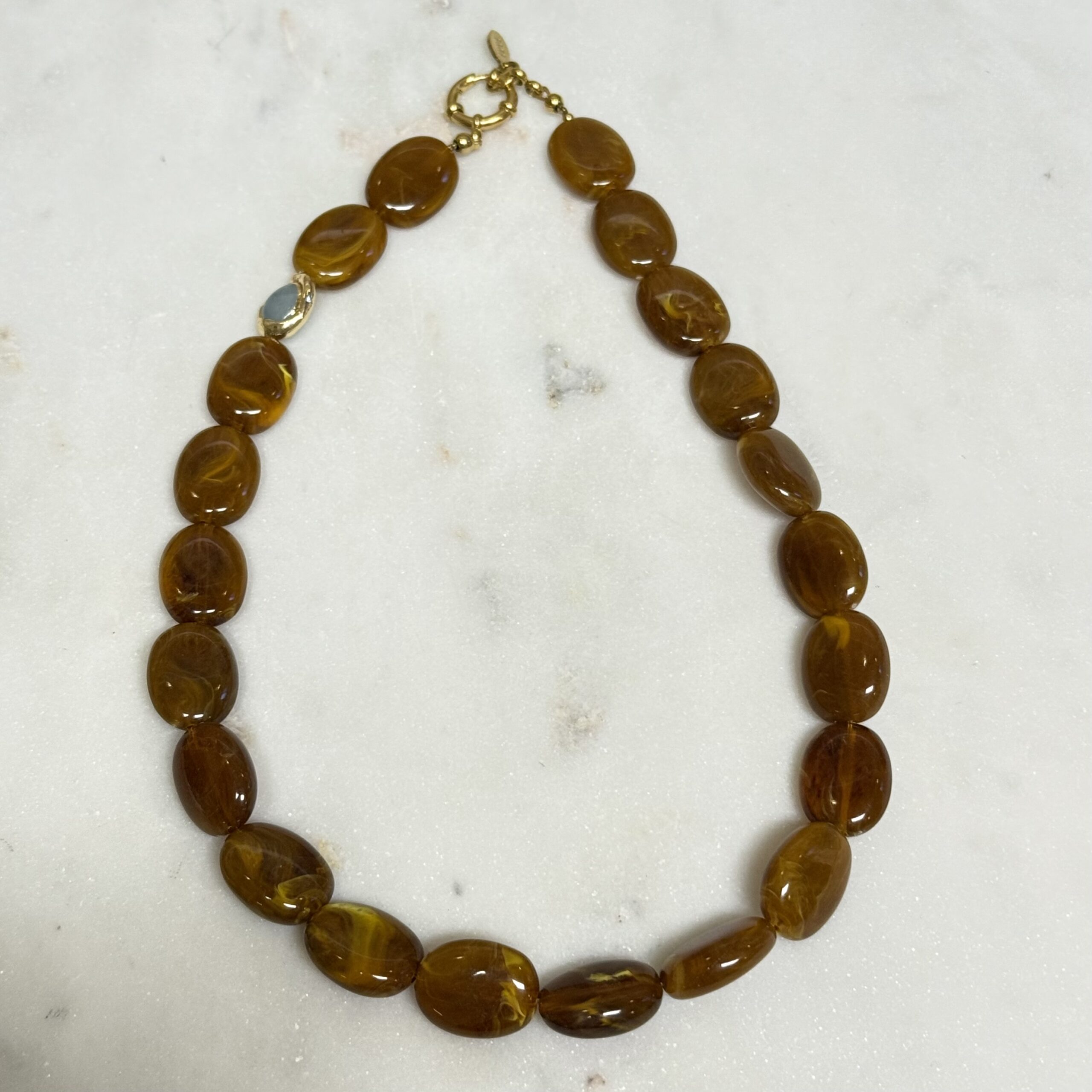 De Ketting Amber Glow is een stijlvolle statement piece die warmte toevoegt aan elke outfit. De prachtige amberkleurige kralen met subtiele marmering zorgen voor een luxe, natuurlijke uitstraling. Door de ovale vorm van de kralen valt de ketting elegant rond de hals, terwijl het gouden slotje een chique touch geeft.