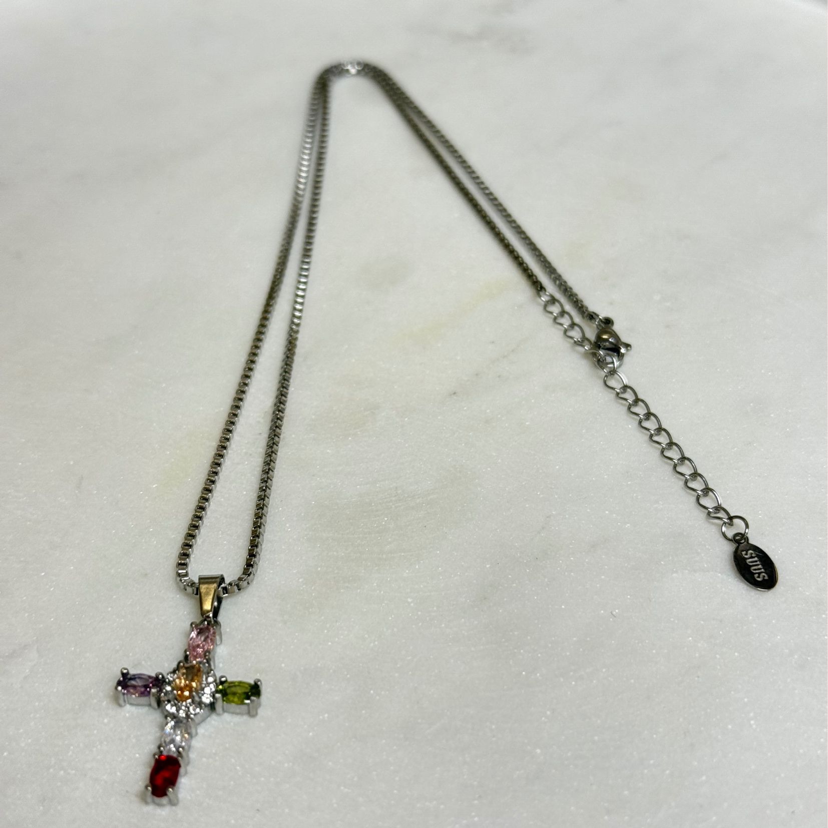 Ketting Celestial Cross is een echte eyecatcher! Het kleurrijke kruisvormige hangertje straalt luxe, power en een vleugje mystiek uit. De ketting is subtiel, maar de steentjes vangen prachtig het licht — perfect om je look nét dat extra beetje sparkle te geven. Draag ‘m solo voor een chic statement of combineer met andere kettinkjes voor een layered effect.