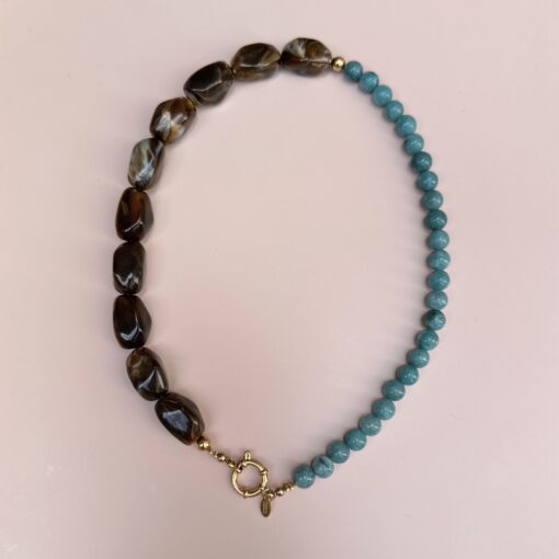 De ketting Ocean Stone is een handgemaakte ketting met turquoise natuursteen kralen en bruine acryl kralen. De ketting heeft een opvallende, natuurlijke uitstraling en is afgewerkt met een stainless steel sluiting die niet verkleurt. Combineer de Ocean Stone ketting met andere SUUSjes voor een stijlvolle boho look!