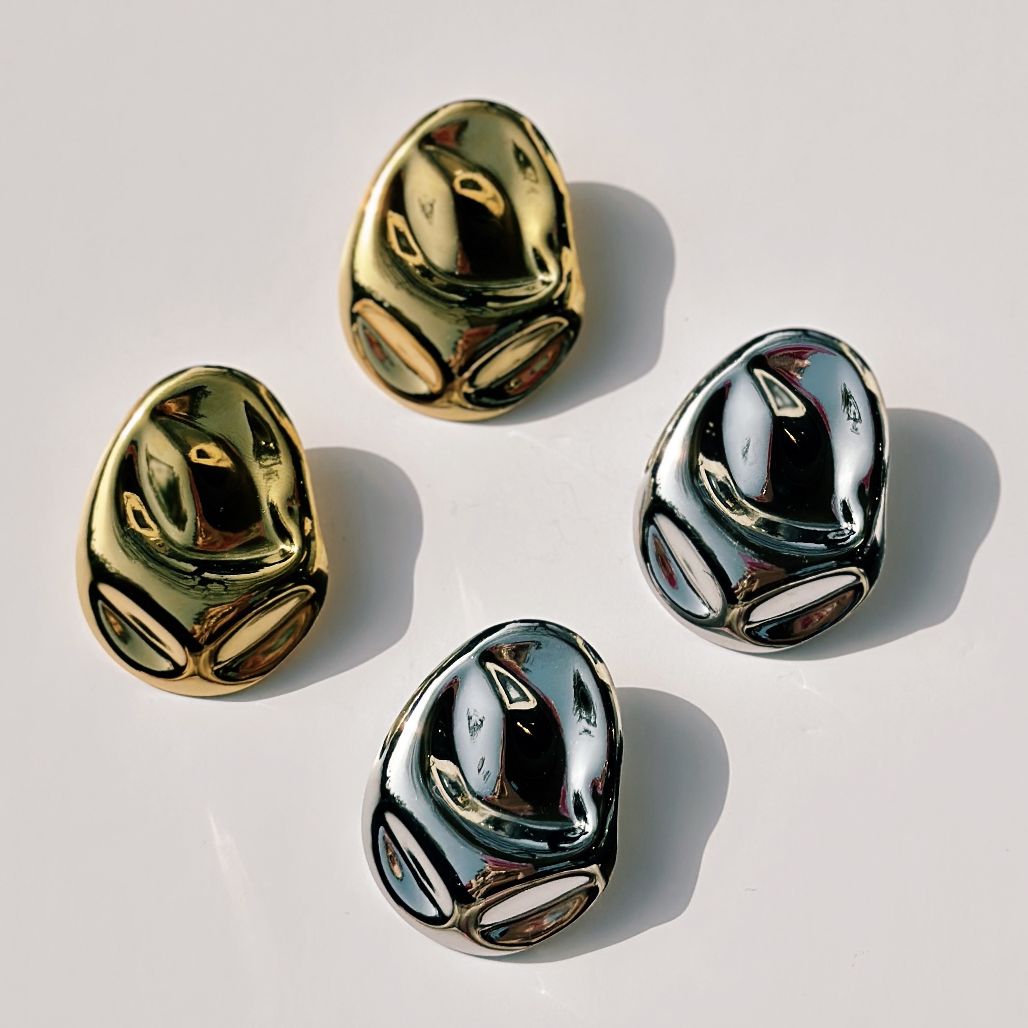 Het ontwerp heeft een zachte, vloeiende vorm die doet denken aan gesmolten metaal. Hierdoor krijgen de oorbellen een unieke en sculpturale look die meteen opvalt. Dankzij het minimalistische design zijn ze tegelijkertijd krachtig én elegant.