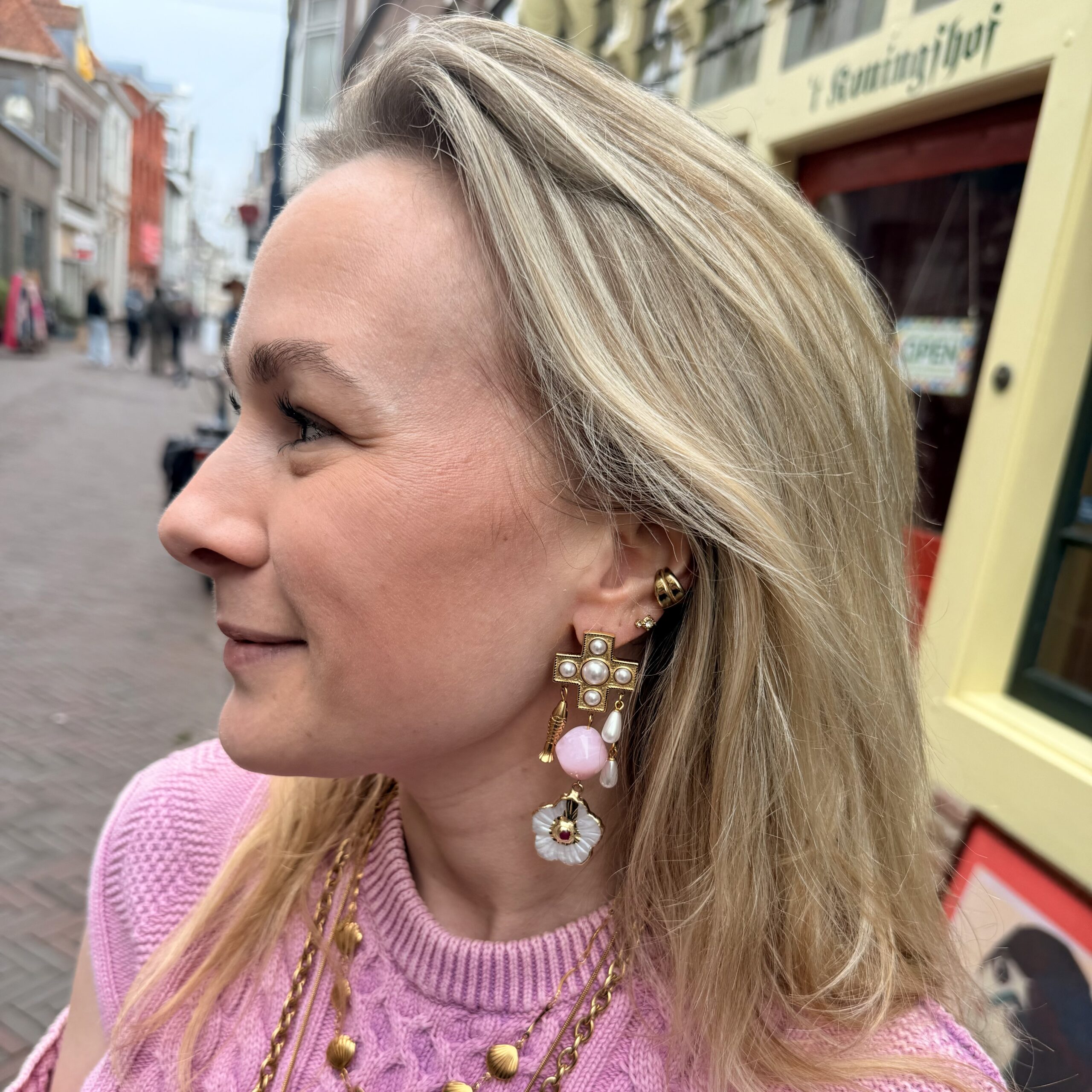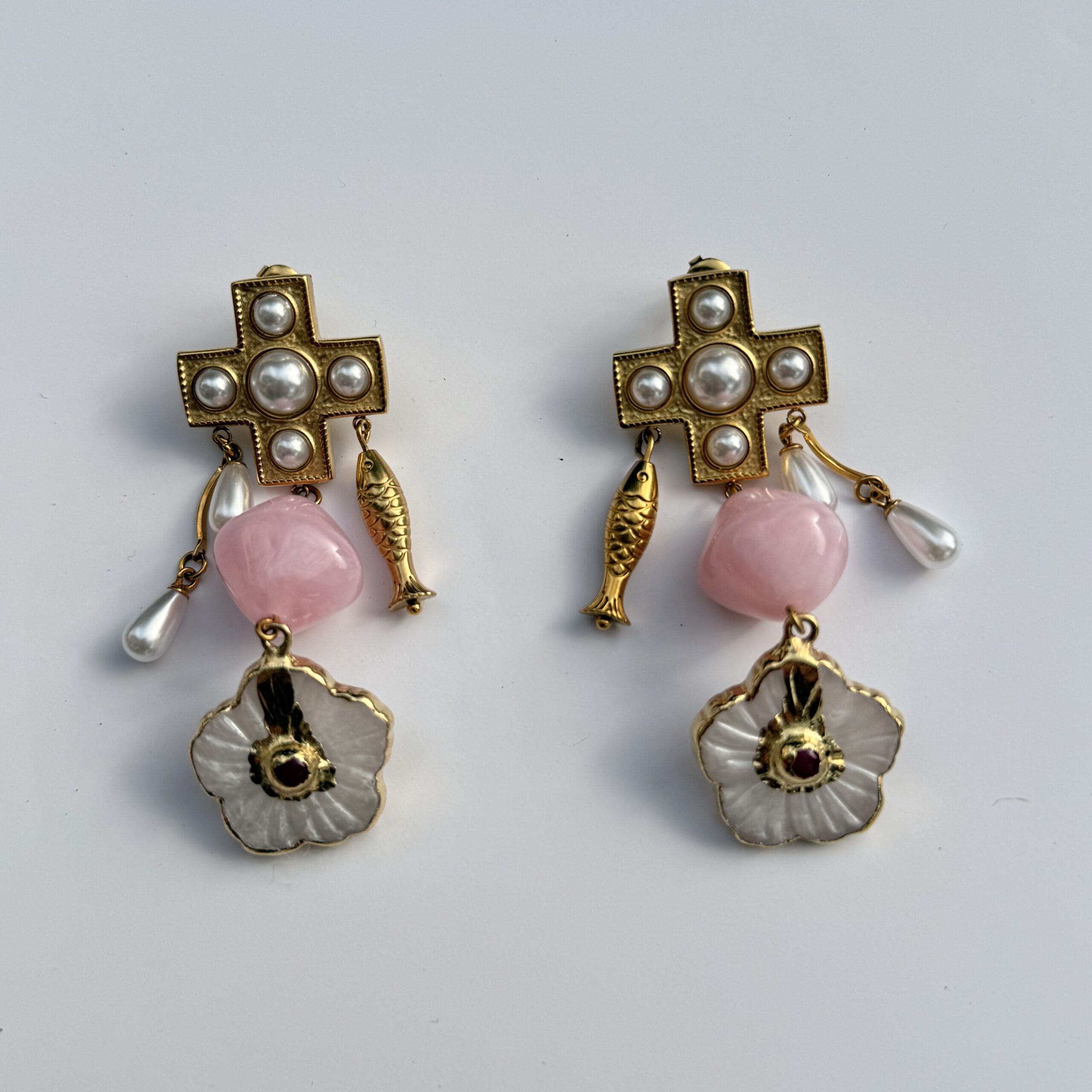 Deze statement oorbellen combineren een gouden kruisvorm met pareldetails, een zachte roze steen en speelse hangende elementen. De bloem onderaan geeft de oorbel een extra vrouwelijke en unieke uitstraling.