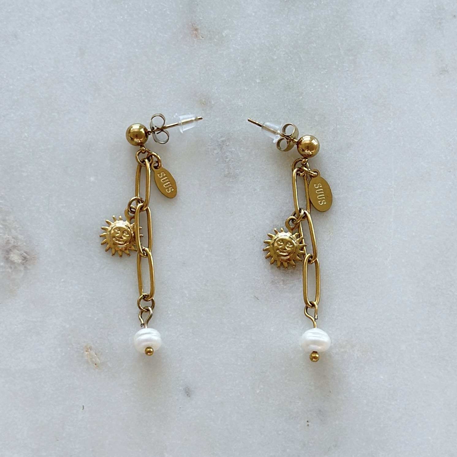 Laat de zon altijd met je meegaan met Oorbellen Sun & Shine. Deze speelse oorbellen combineren een vrolijk zonnetje met een elegante parel en een stijlvolle schakel. Gemaakt van stainless steel, dus perfect voor dagelijks gebruik én waterproof. Een echte eye-catcher die elke outfit laat stralen!