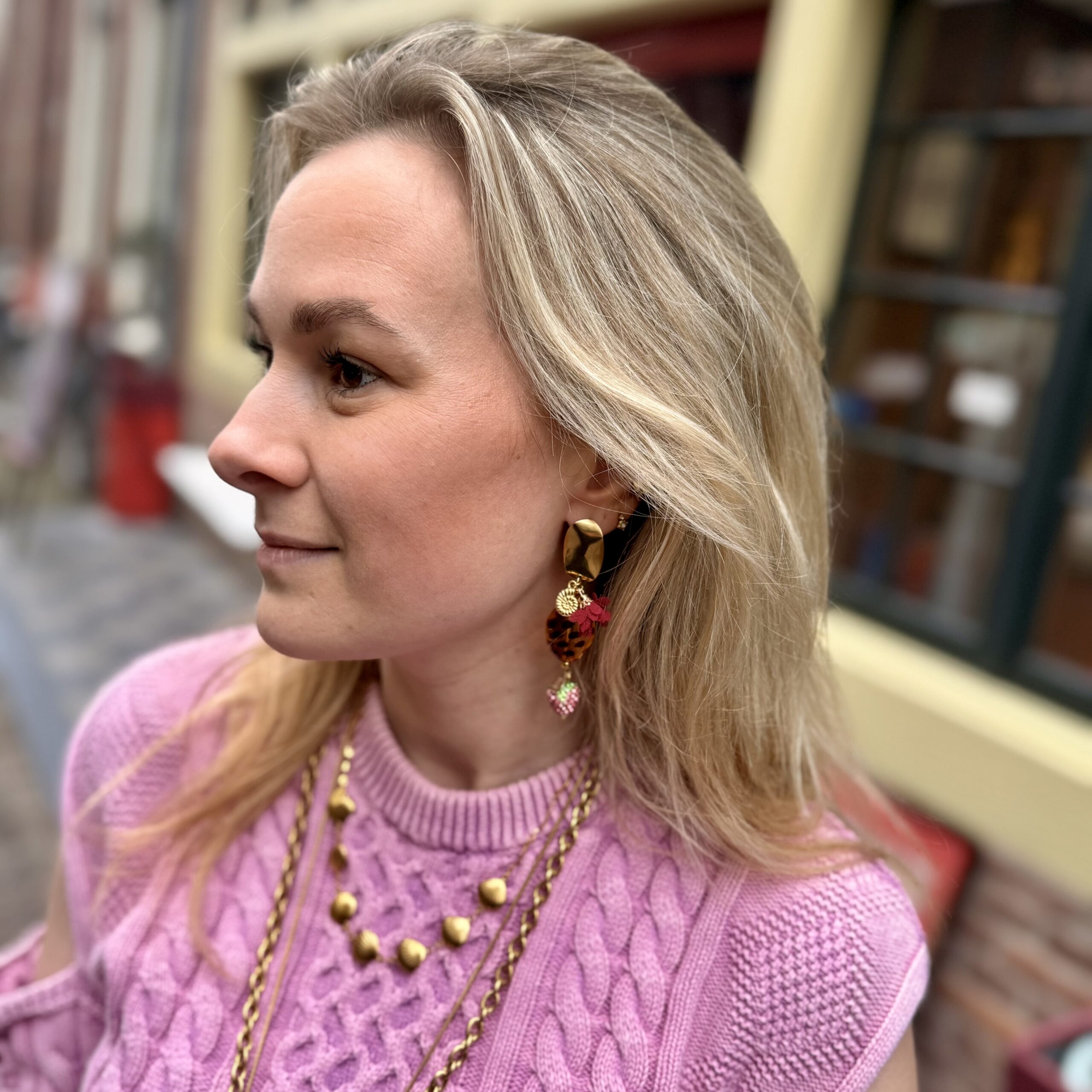 Deze opvallende oorbellen combineren een gouden basis met verschillende hangende details. Het leopard element, de roze accenten en de speelse bedels zorgen samen voor een unieke en trendy look.