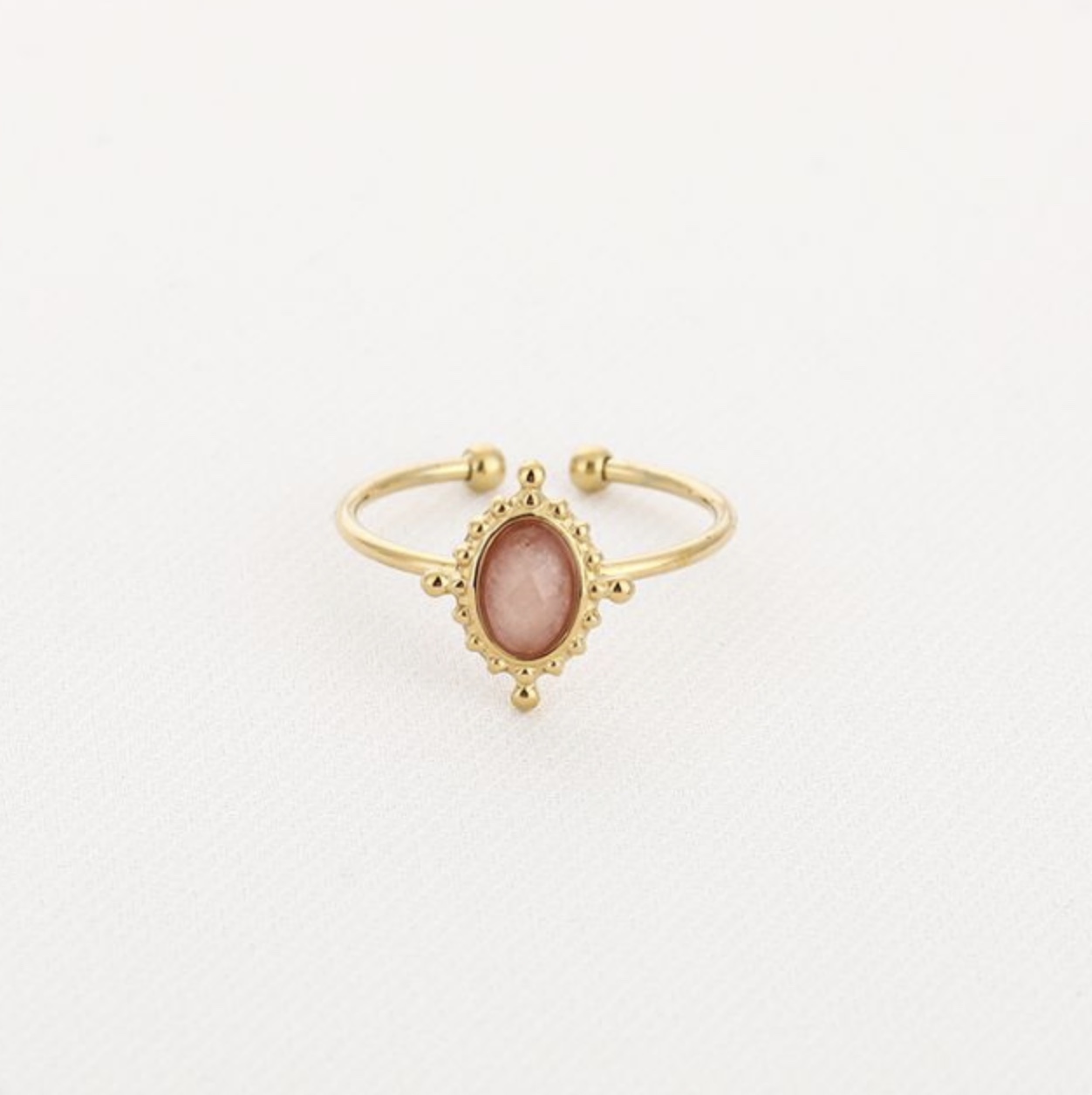 Ring Amour – Roze, is een romantische eyecatcher met een zachte blush-roze ovale steen in een verfijnde gouden setting met bohemian details.