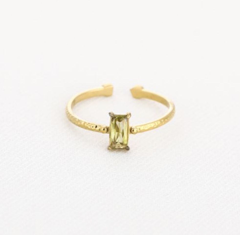 De rechthoekige steen in een warme olijfkleur geeft deze ring een luxe, natuurlijke uitstraling die perfect past bij zowel everyday outfits als chique looks.