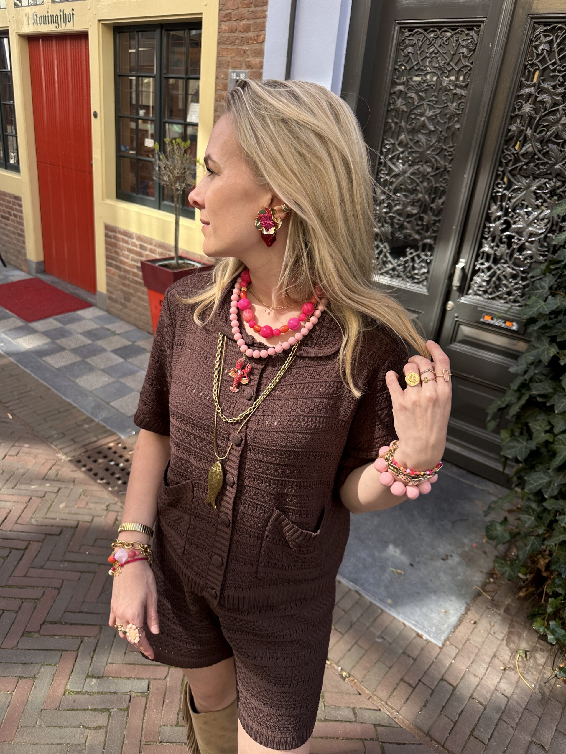 Deze tweedelige set bestaat uit een luchtig gebreid shirt met knoopjes en een bijpassende short. De subtiele structuur in de stof geeft ‘m een luxe uitstraling, terwijl de fit juist heerlijk relaxed zit.