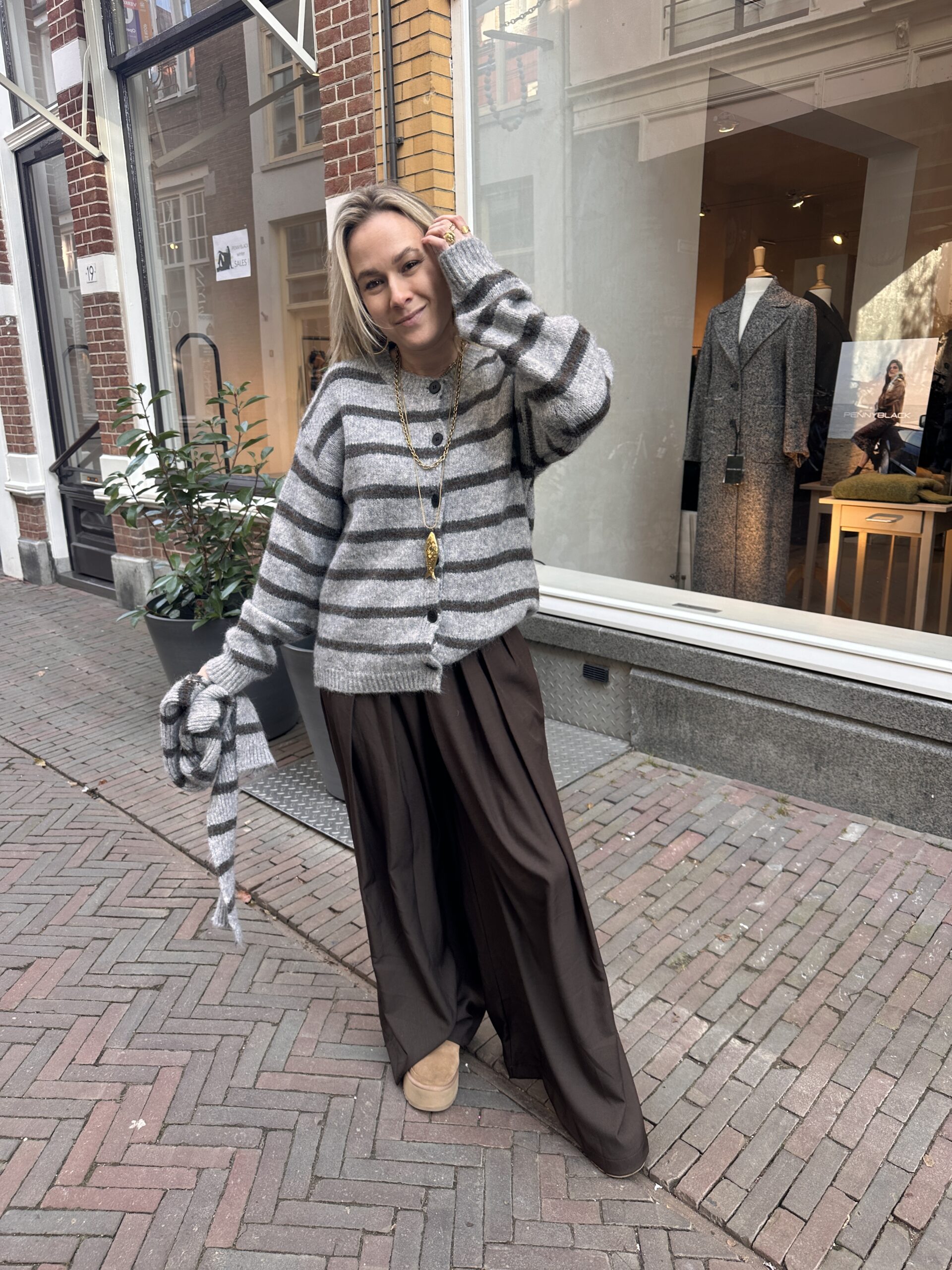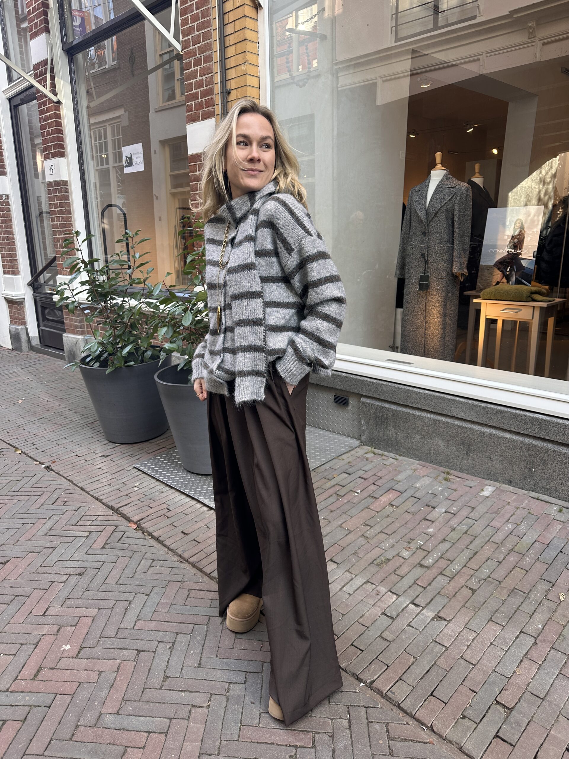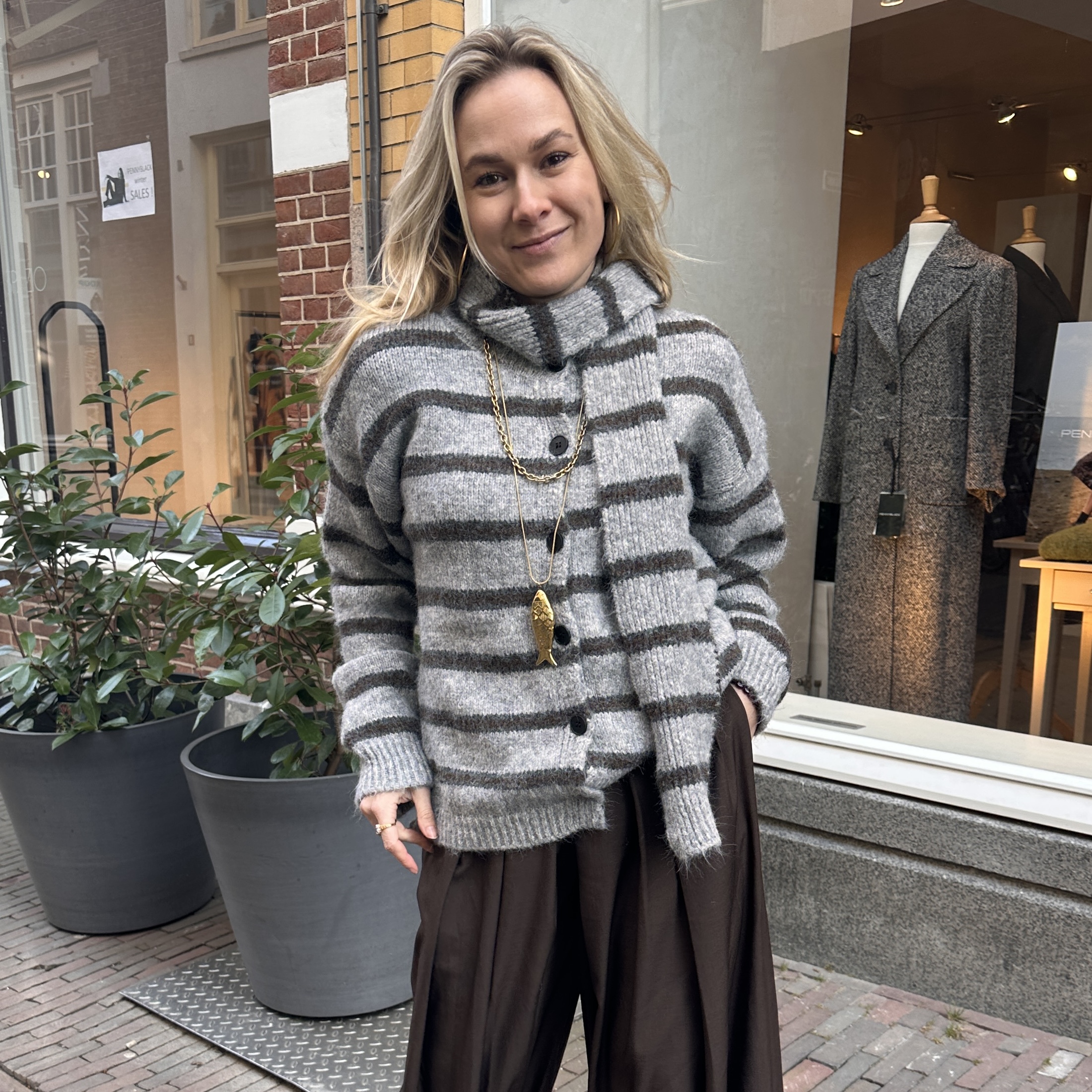 Deze zachte gebreide trui met subtiele grijze strepen en een matchend sjaaltje geeft je meteen die effortless, cozy-chic look.