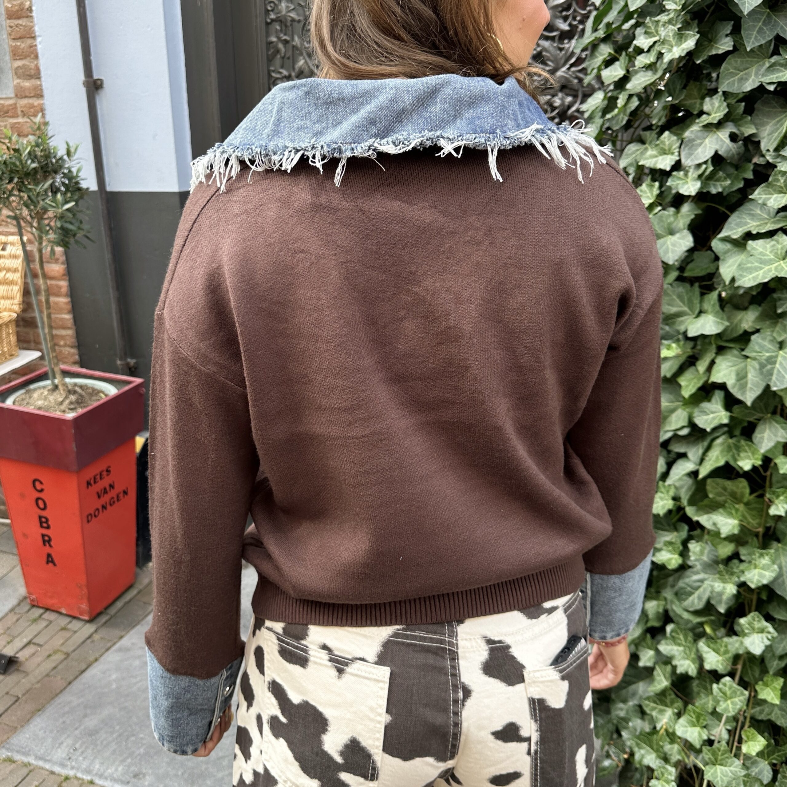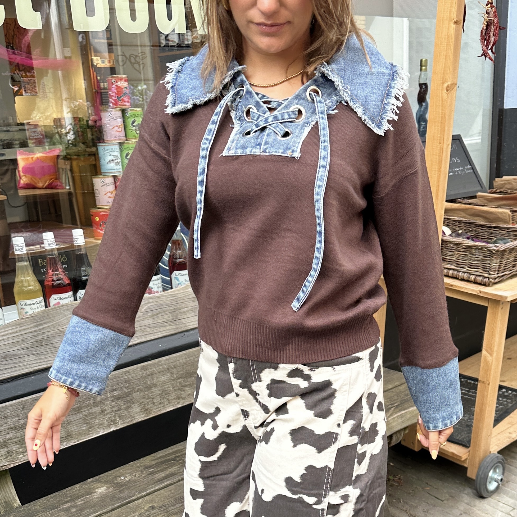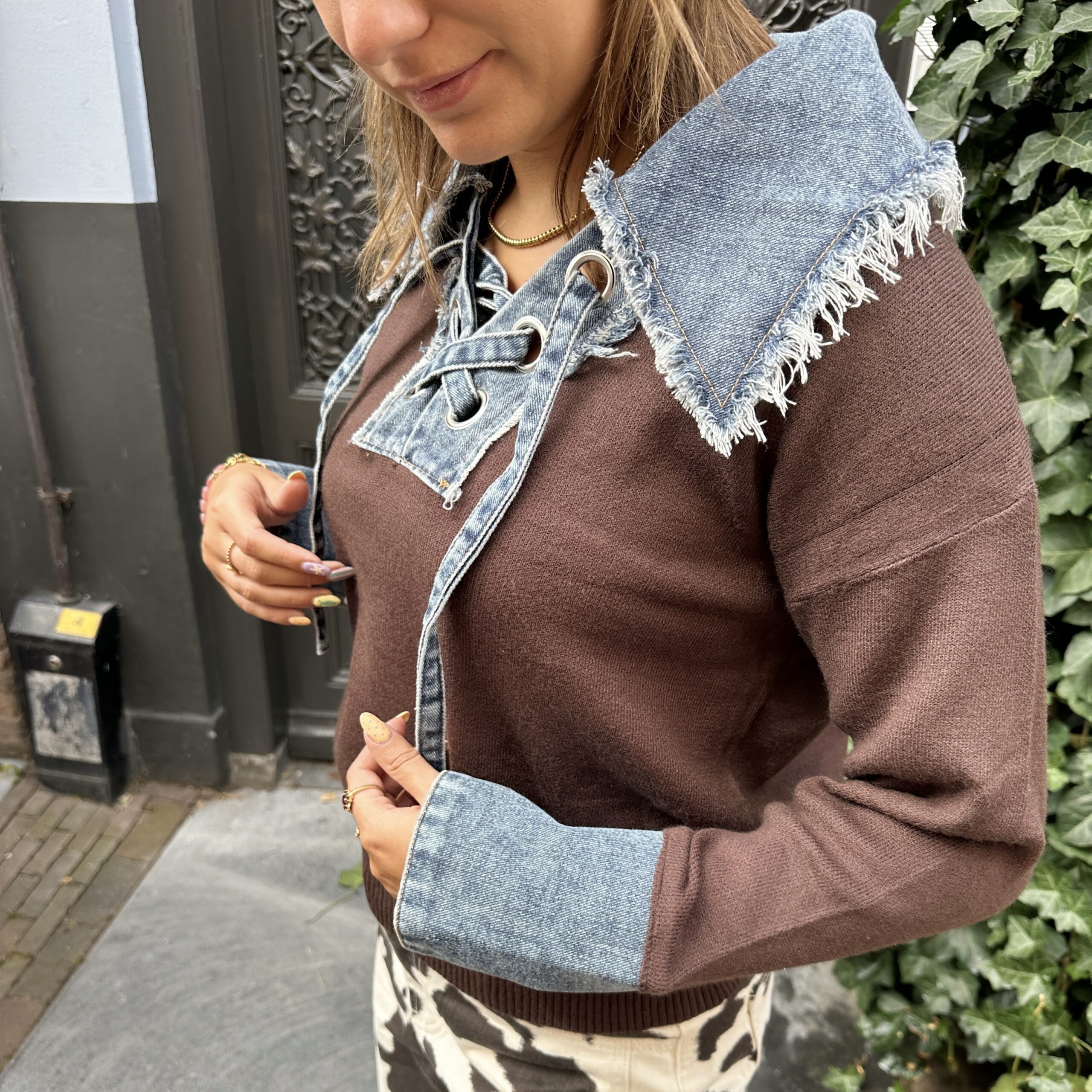 De Trui Denim Dreams is een echte eyecatcher! Deze bruine trui krijgt een stoere twist door de denim details bij de kraag en manchetten. De speelse vetersluiting maakt hem uniek en helemaal SUUS. Dankzij de one size fits all pasvorm draag je deze trui altijd comfortabel en stylish. Perfect voor een casual dagje uit of om je outfit een fashionable upgrade te geven.